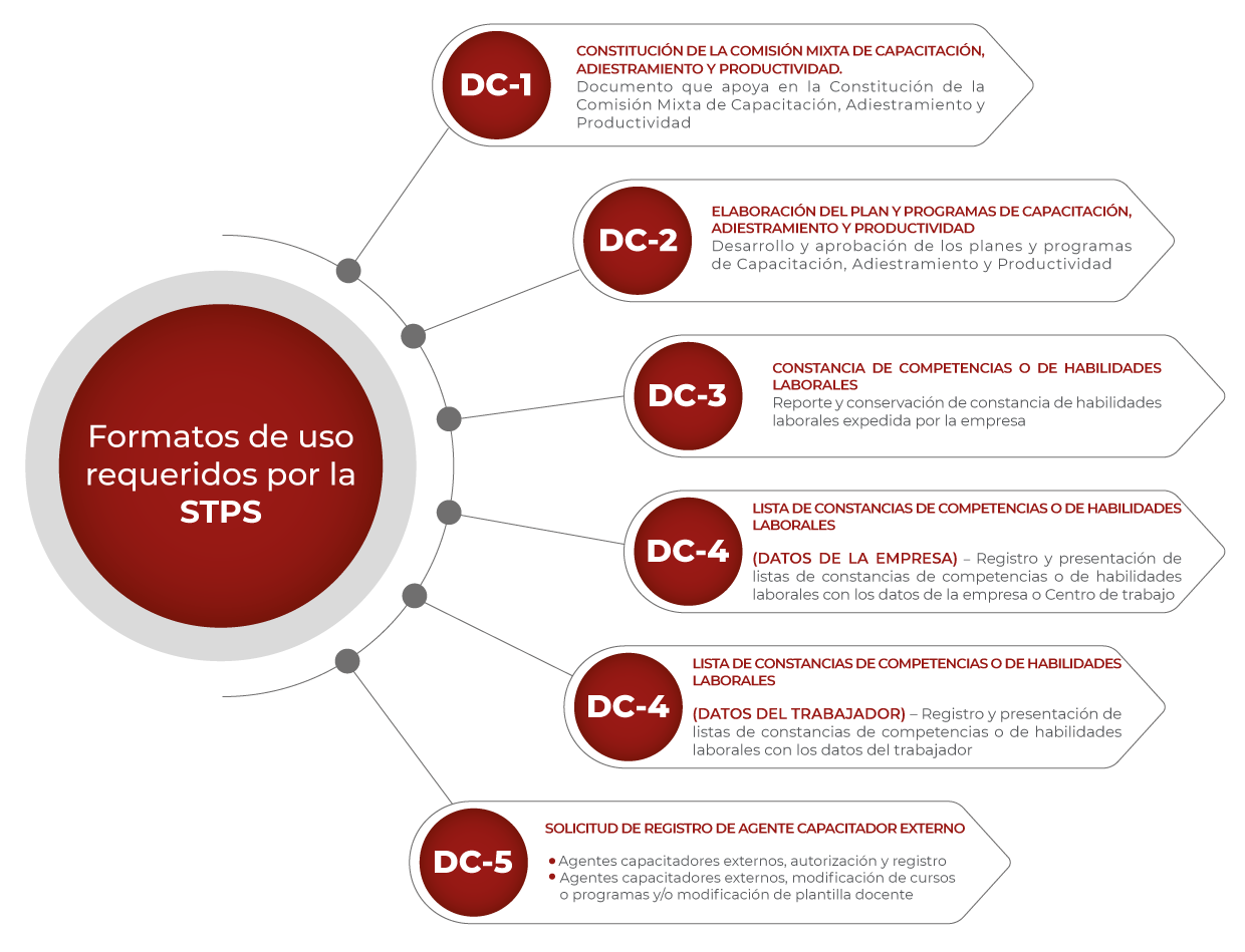 El centro de trabajo de trabajo deberá mantener en sus registros internos y presentar a la STPS, cuando ésta así lo requiera, la información de sus programas de Capacitación, Adiestramiento y Productividad, de los formatos de registro, de la Comisión Mixta y de las Constancias de Habilidades, que se señala a continuación: